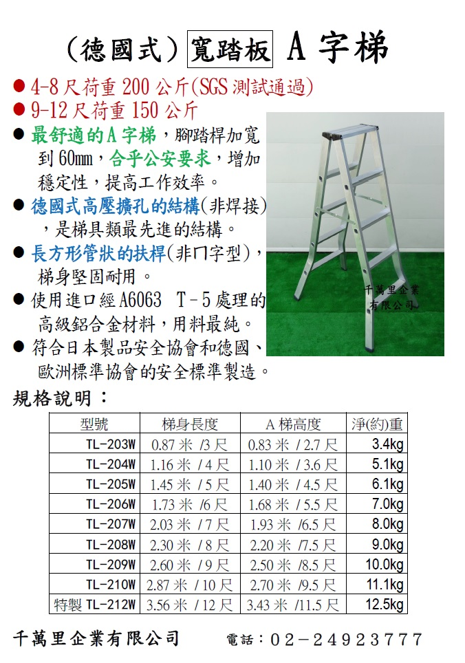 十二尺以上請選擇本公司的另二款:"可調折梯、萬用梯"或"挑高A字梯"