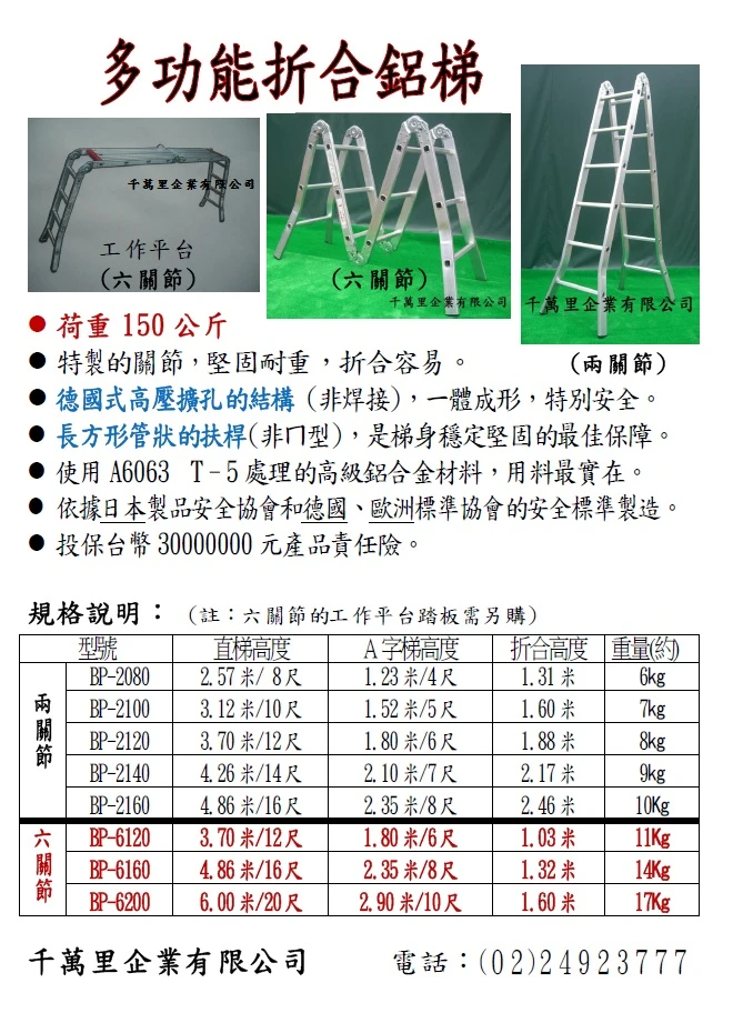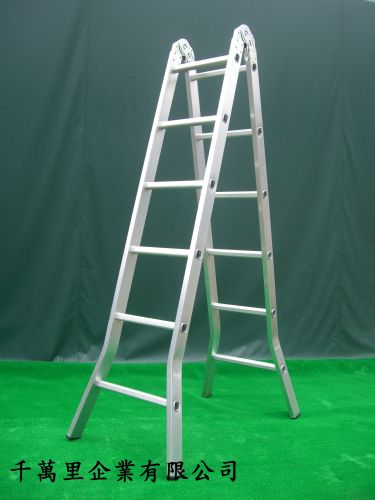 (二關節)折合鋁梯、直馬梯、折梯 高荷重150公斤(SGS測試通過) 整支長方形管狀的鋁管製成的扶桿(非ㄇ字型),梯身穩定不顫抖或搖晃,並且超級耐用。 和外銷同等級的德國式高壓擴孔再外捲的結構